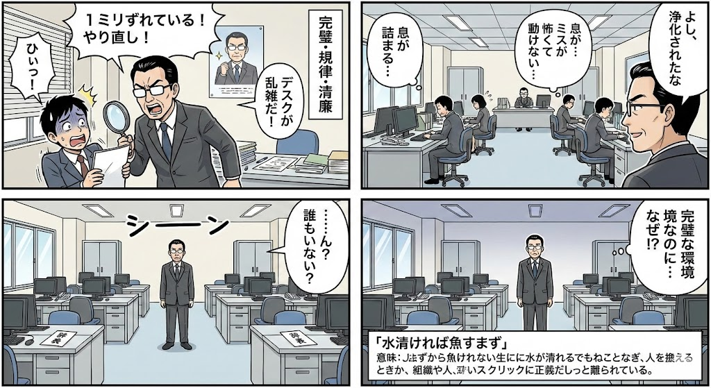「君の指摘はいつも正しいけれど、あまり細かく詰めすぎると部下が萎縮してしまうよ。**『水清ければ魚すまず』**と言うだろう? 多少の失敗は目をつぶって、彼らが働きやすい環境を作るのも大切だよ。」