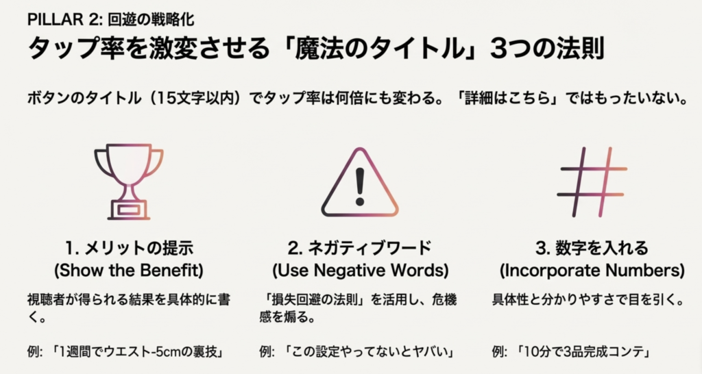 成功の鍵:魅力的なタイトル設定 この機能の効果を最大化するには、ボタンに表示されるタイトル(15文字以内)が極めて重要となる。「ここをタップ」のような安易な文言では効果は薄い。タップ率を飛躍的に高めるための3つのコツが存在する。
