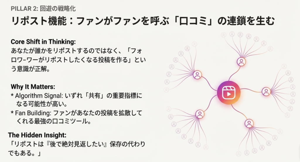 本質的理解: リポストは、「誰かにシェアしたい」という共有欲求と、「後で絶対に見返したい」という保存欲求の2つを同時に満たす行為である。この2つの欲求を刺激するコンテンツ作りが、爆発的な拡散を生む鍵となる。