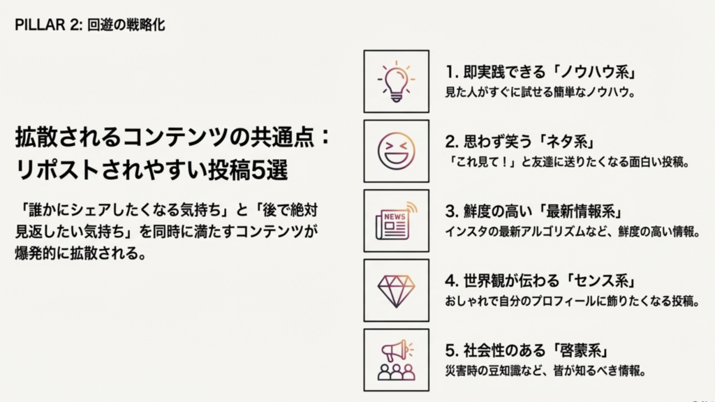 | 3. 最新情報 | Instagramのアルゴリズム変更など、鮮度の高い情報。 | 情報価値の高さから拡散したくなる、または情報を知っていることをアピールしたいという動機からリポストされやすい。 |