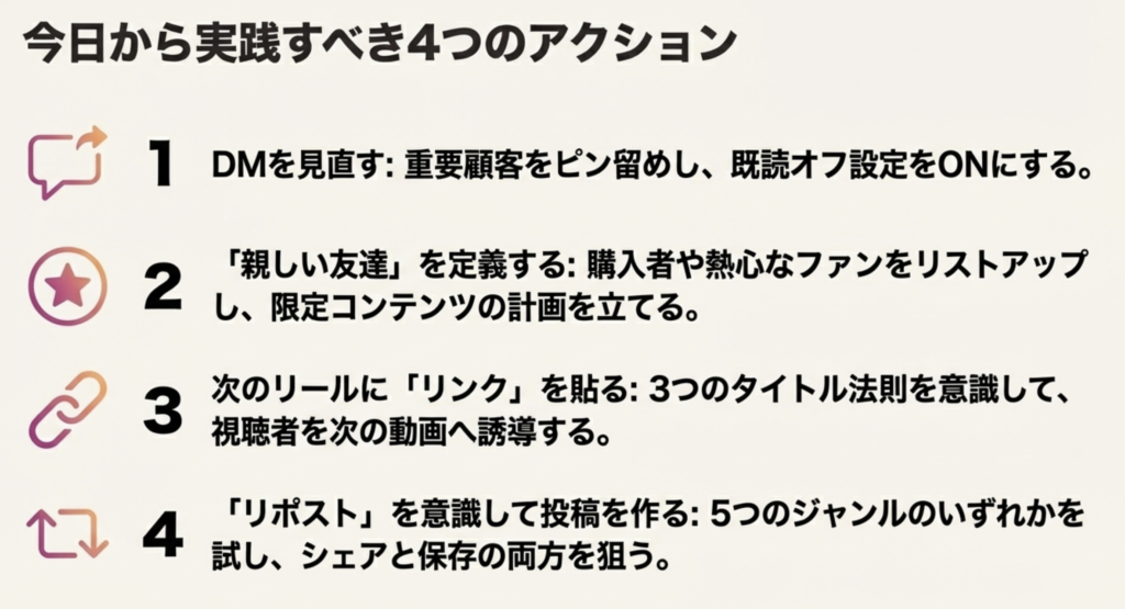 本ブリーフィングは、2025年下半期にInstagramで導入された4つの最新機能が、特にプラットフォーム上での集客と収益化に与える影響について分析するものである。これらの新機能(DMの進化、親しい友達限定投稿、リールリンク、リポスト機能)は、単なる利便性の向上に留まらず、ユーザーエンゲージメント、ファン化、そして最終的な販売プロセスを根本から変革する潜在能力を秘めている。早期にこれらの機能を理解し、戦略的に活用することが、競合との差別化と収益機会の最大化に直結する。最も重要なのは、これらのツールを駆使しつつも、フォロワーのために価値あるコンテンツを提供し続けるという本質的な運用姿勢である。