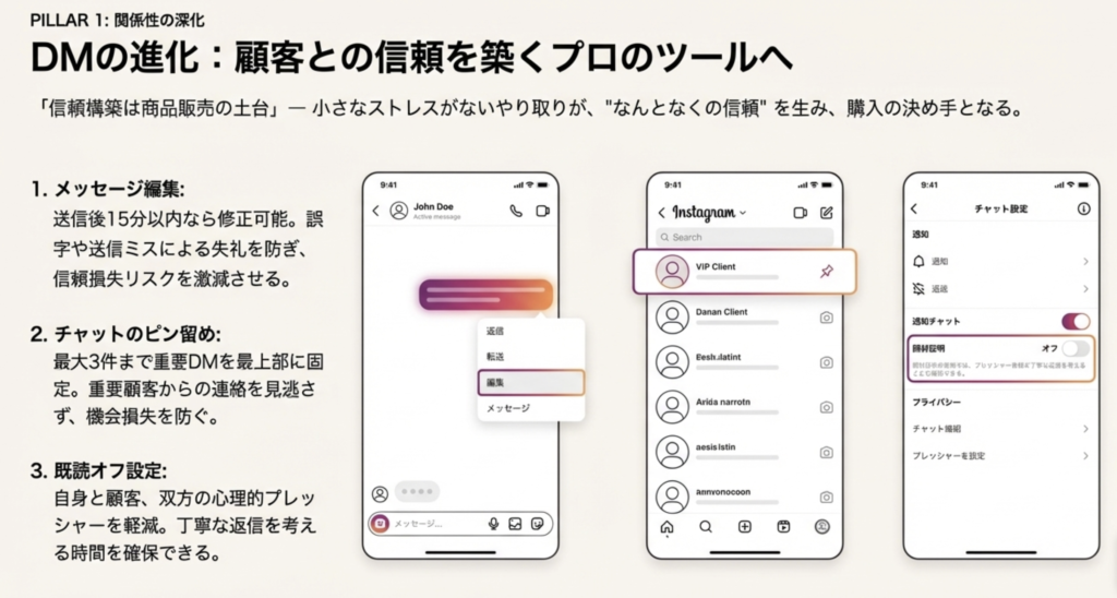 Instagramでの収益化において、ダイレクトメッセージ(DM)を通じたフォロワーとの信頼関係構築は、フォロワー数以上に重要な要素である。今回のアップデートでは、この関係性を深化させ、よりプロフェッショナルな顧客対応を可能にする3つの機能が追加された。