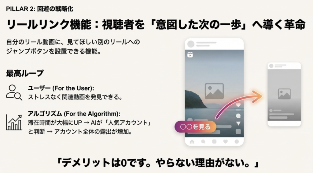 • アルゴリズム上の優位性: 複数動画の連続視聴を促し、アカウントの総滞在時間を増加させる。滞在時間が長いアカウントは、InstagramのAIから「人気があり、価値が高い」と判断され、おすすめに表示されやすくなる。結果として、アカウント全体のリーチが拡大するという好循環が生まれる。