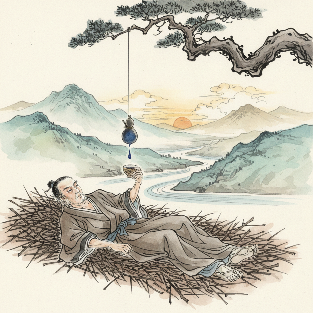 まず「薪の上に寝る(臥薪)」の故事から始まります。呉の王・夫差(ふさ)は、父・闔閭(こうりょ)が越との戦いで討ち死にしたことへの復讐を誓いました。彼は父の無念を忘れないよう、あえて固い薪の上に寝て眠り、その痛みで復讐の気持ちを燃やし続けました。そしてついに越を破り、宿願を果たします。
