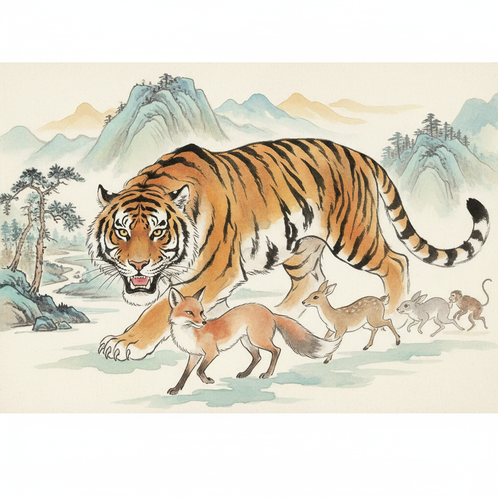 そこで江乙(こういつ)という家臣が、次のような寓話を語りました。「ある日、虎が狐を捕まえました。すると狐は『私を食べてはいけない。天帝が私をすべての獣の王にしたのだから』と言い、『信じられないなら、私の後ろをついてきてごらん』と提案しました。虎が狐の後ろを歩いていくと、確かに獣たちは皆、逃げ去っていきます。虎は獣たちが自分自身を恐れているとは気づかず、狐を恐れているのだと思い込んでしまいました。」